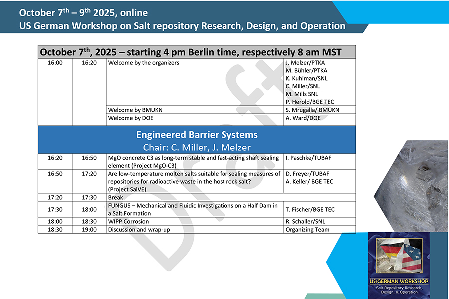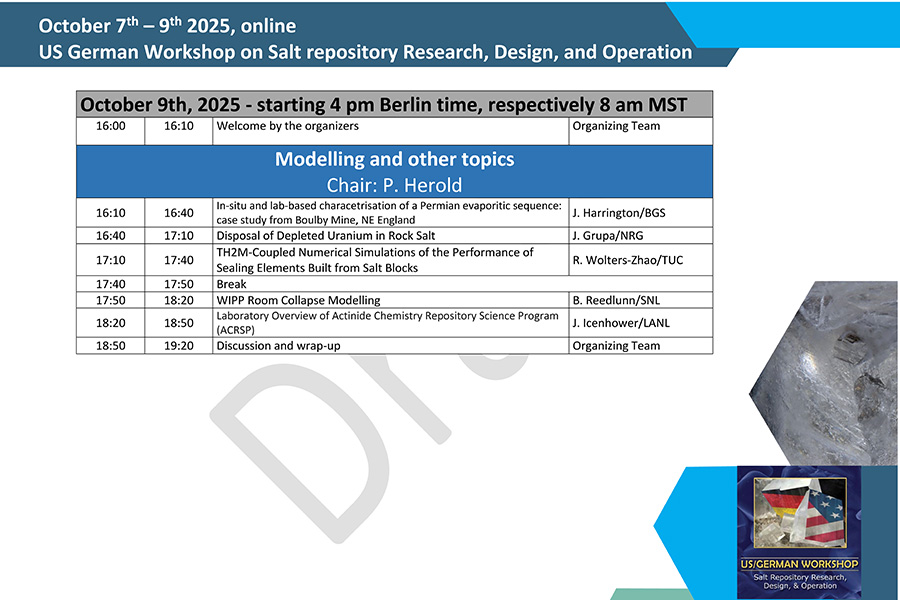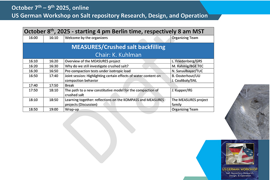 We are pleased to inform you that the 15th US German Workshop on Salt Repository Research, Design, and Operation will take place online from 7th to 9th October 2025.